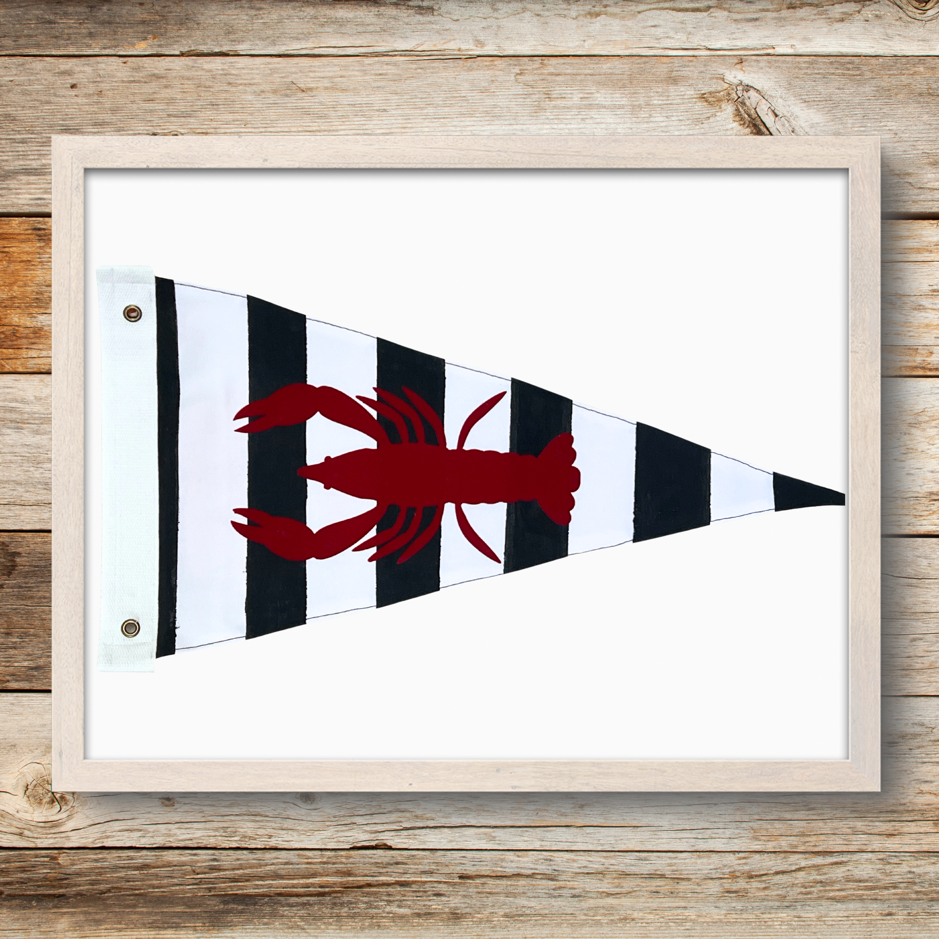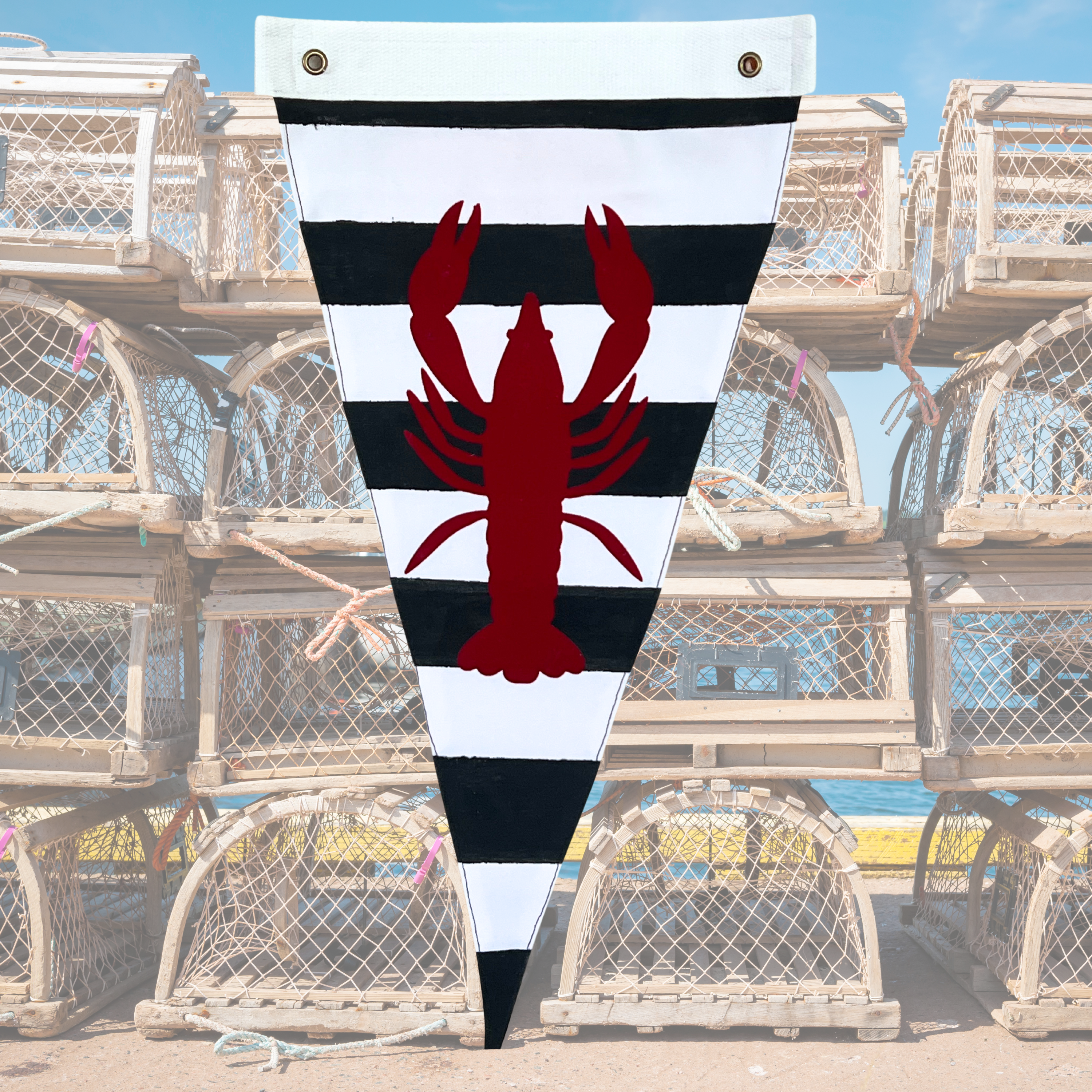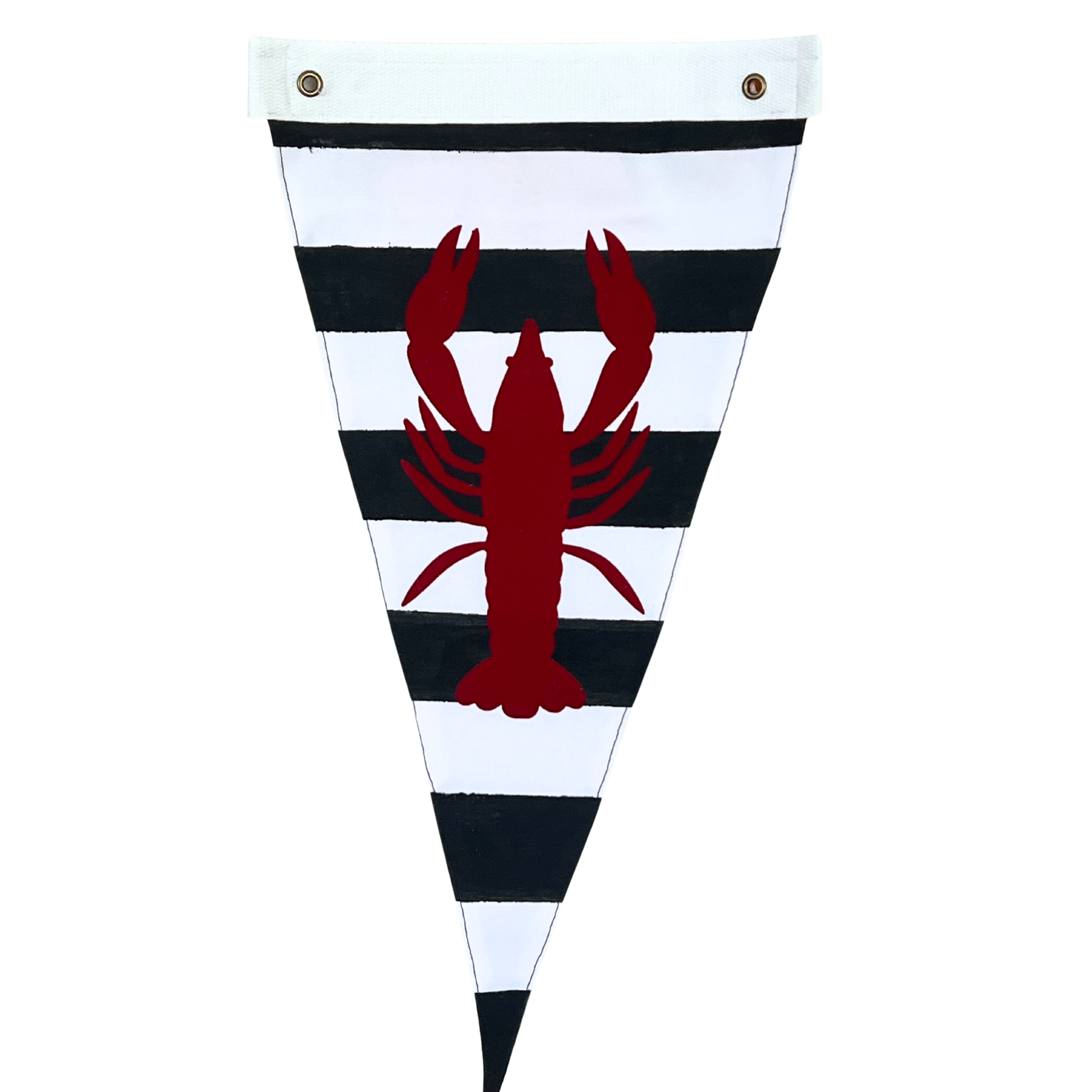 This stylish nautical pennant flag features bold black and white stripes, accented by a Maine Lobster silhouette at the center. Crafted from durable canvas fabric with metal grommets makes it easy to hang indoors or outdoors. Perfect for a boat, beach house, or coastal themed decor.
