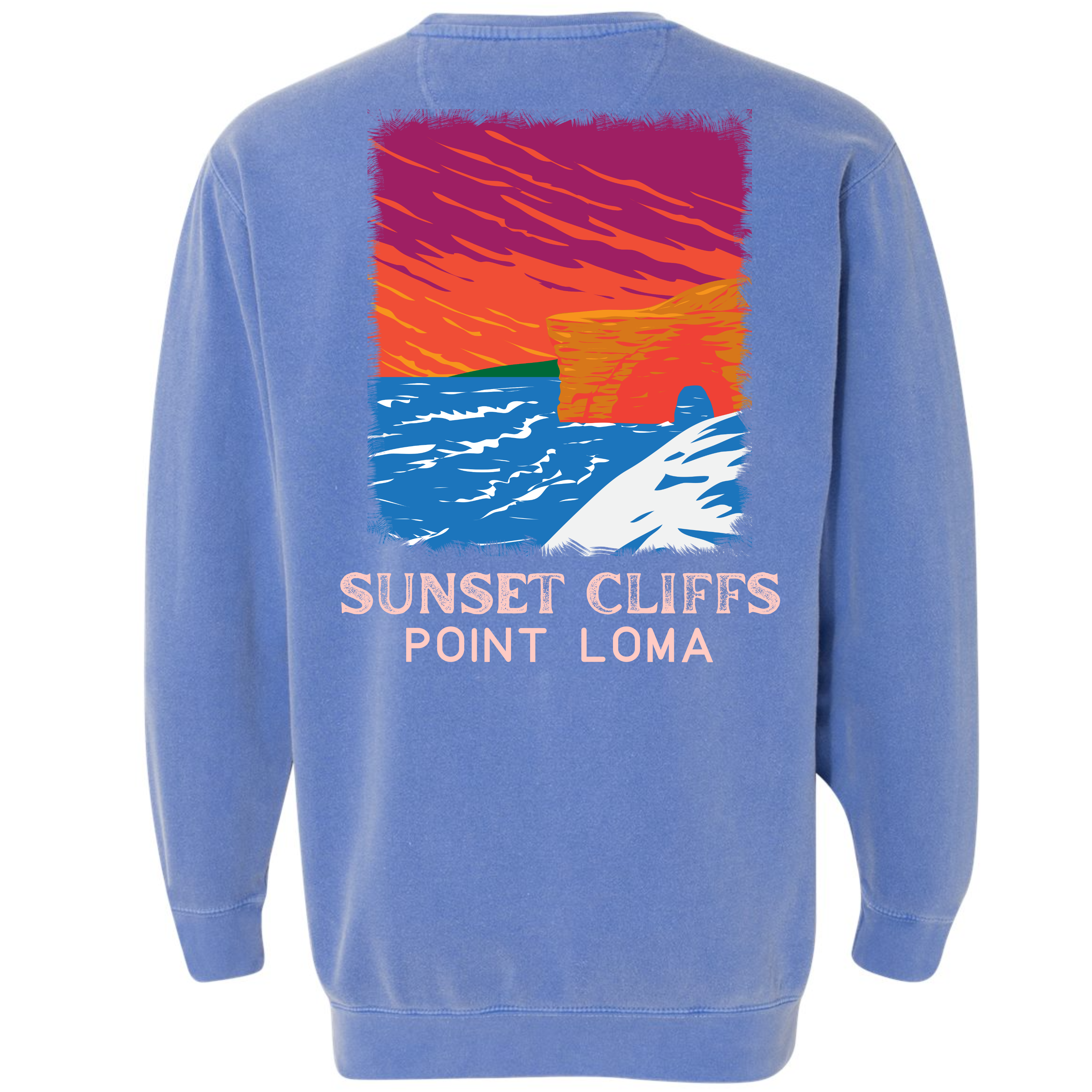 From our California Beach Collection, this Sunset Cliffs - Point Loma garment dyed crewneck sweatshirt is guaranteed to please! Our sweatshirt has an oversize / unisex fit. If you want a smaller fit, we suggest you size down since this sweatshirt is pre-shrunk due to its dye process. We guarantee it will be your favorite sweatshirt because of it's softness and comfort. Our bright "SUNSET" design is a Direct to Garment print that will last a lifetime. Make sure you check out our size chart for exact measurements to ensure your perfect fit.