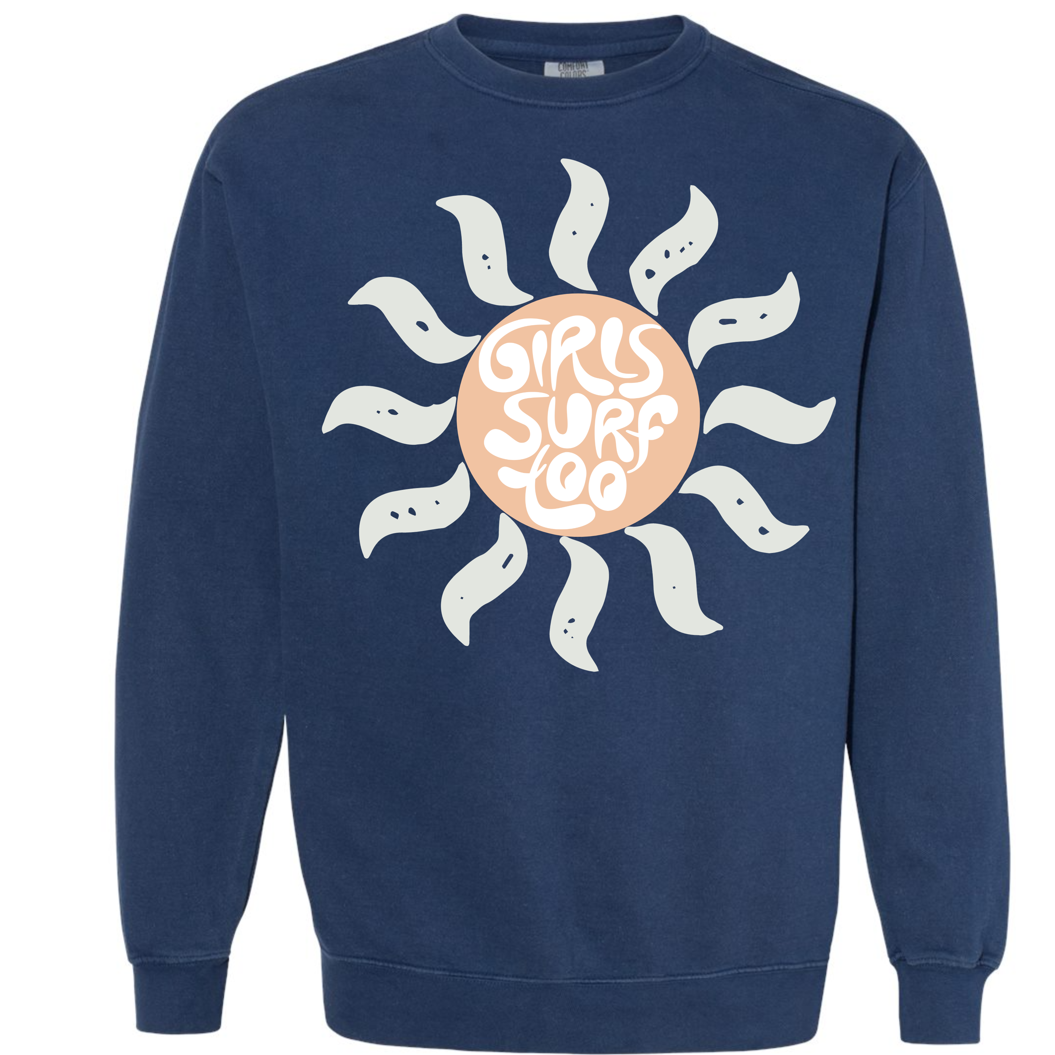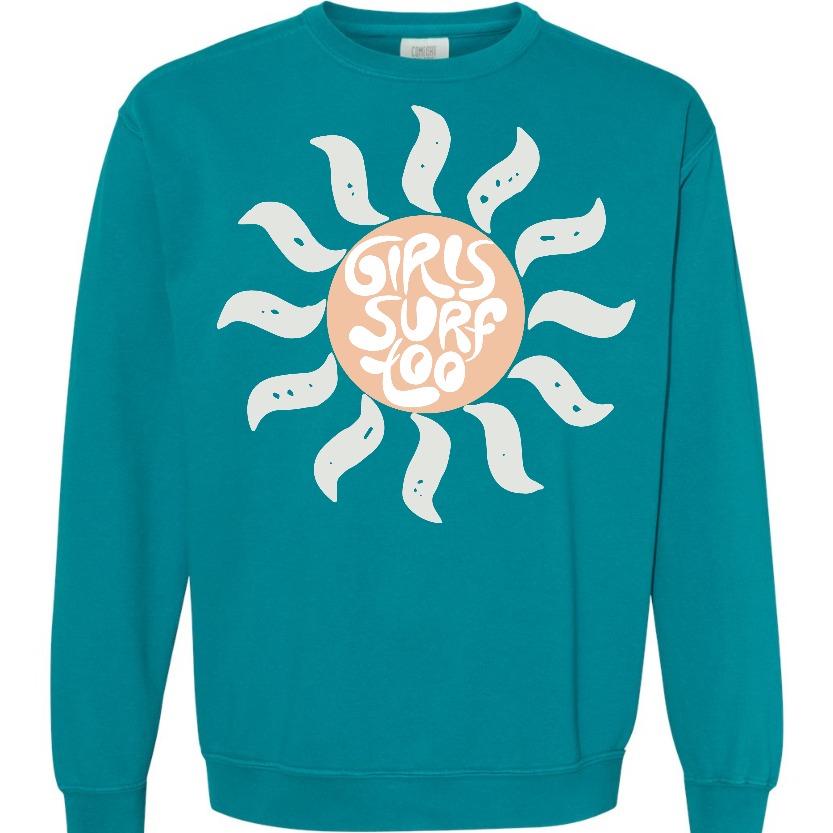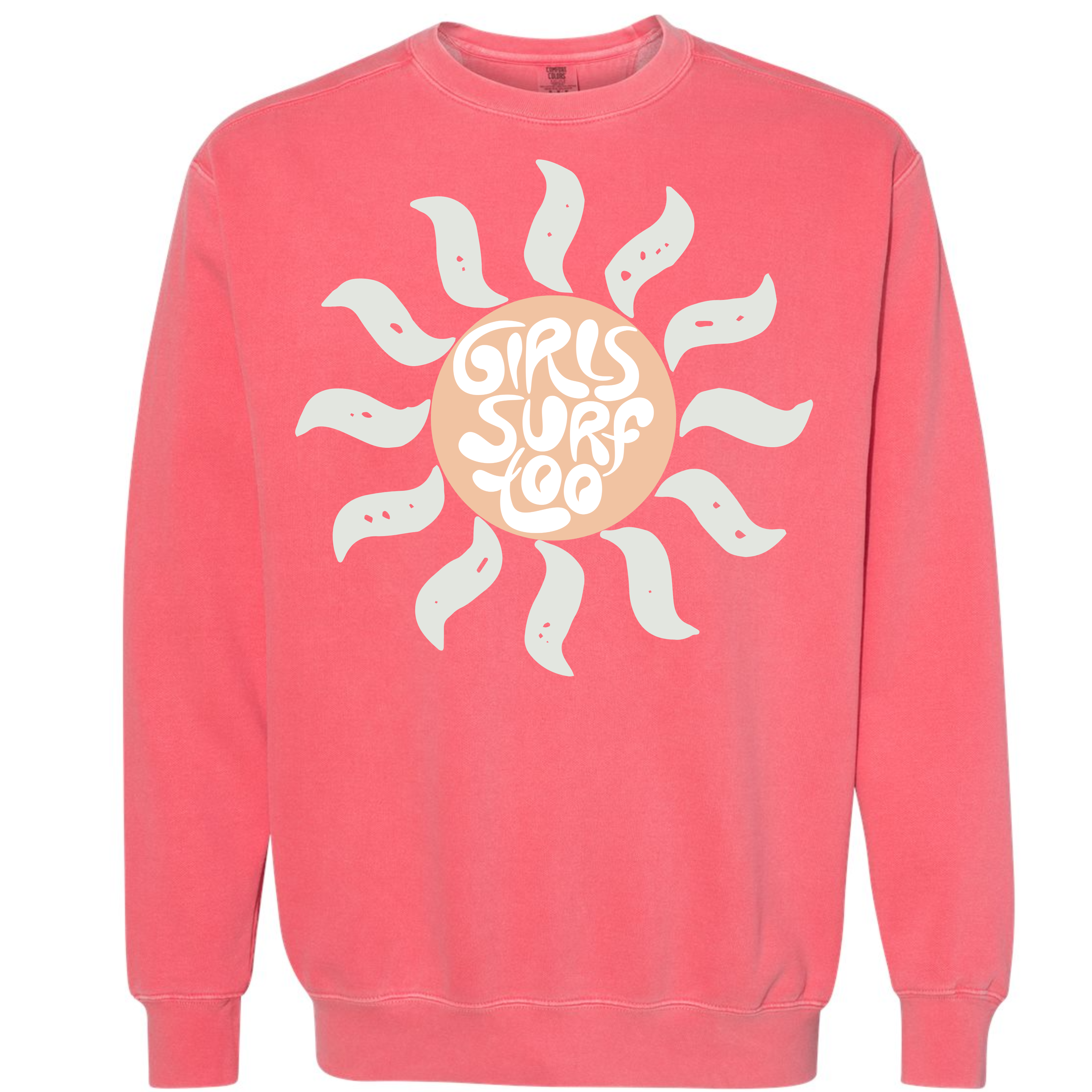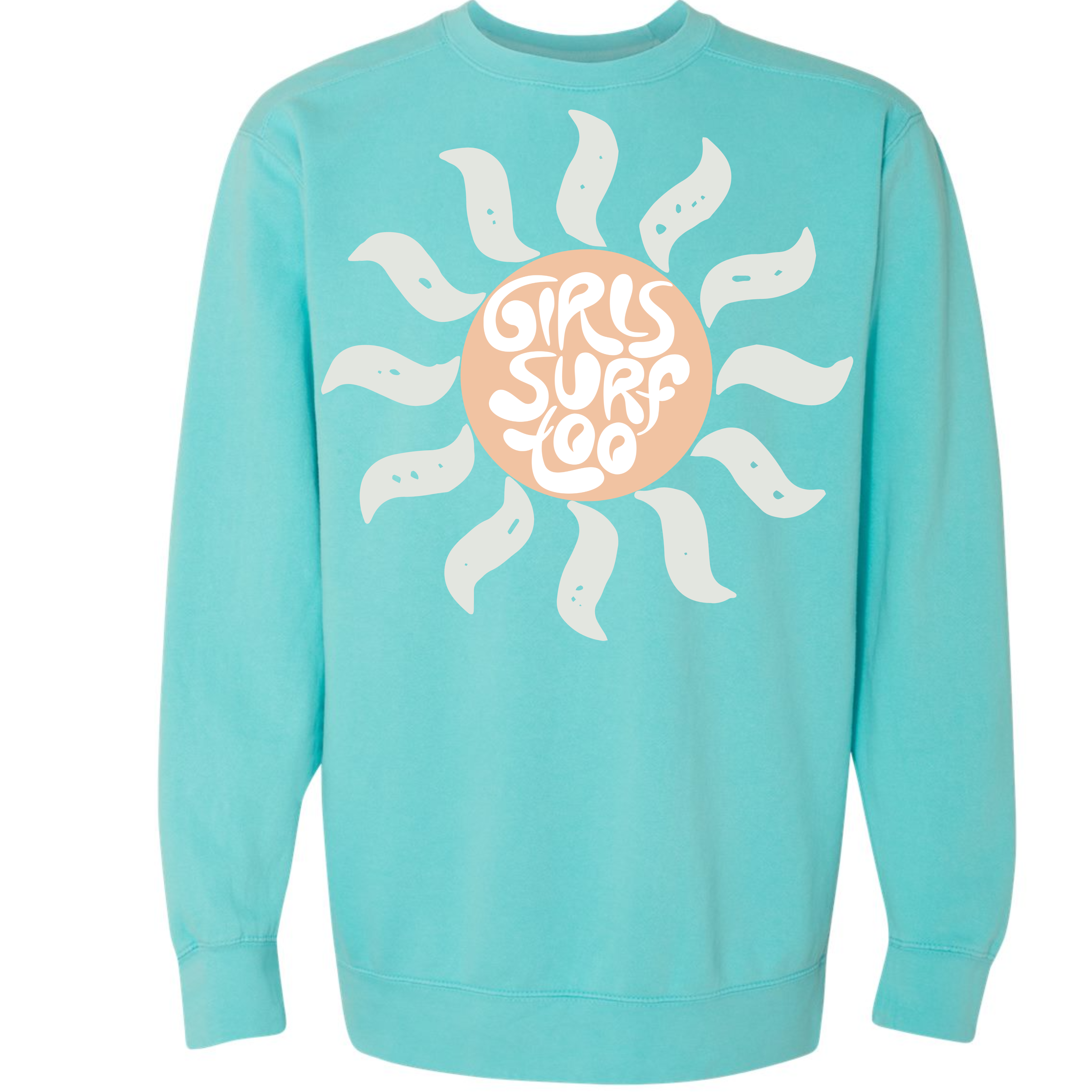 Let everyone know that Girls Surf Too! The softness of our long-sleeve crewneck sweatshirt is because it's garment dyed. This sweatshirt is unisex and has an oversized fit. If you want a smaller fit, we suggest you size down since this sweatshirt is pre-shrunk due to its dye process. We guarantee it will be your favorite sweatshirt because of its comfort. Our bright "girls surf too" design is a Direct to Garment print that will last a lifetime. Make sure you check out our size chart for exact measurements to ensure your perfect fit.